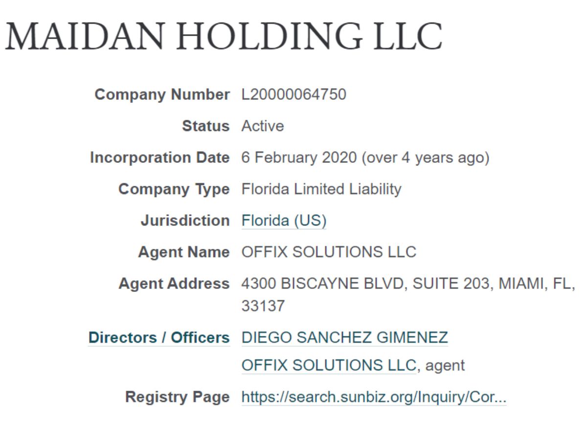 Maidan Holding tiene más de 12 empresas en diferentes países. El nombre del holding proviene de la Maidán Nezalézhnosti o «Plaza de la Independencia», situada en Kiev, Ucrania, país donde Sánchez ha estado haciendo negocios desde al menos 2017. Esta plaza fue el escenario de intensas protestas que culminaron con la renuncia del presidente prorruso Viktor Yanukovich el 22 de febrero de 2014.