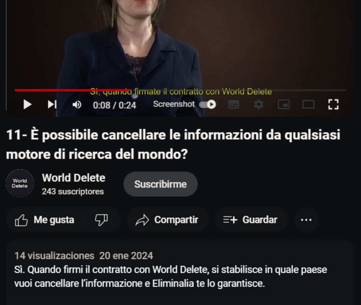 El 20 de enero de 2024, un video promocional, protagonizado por la modelo y actriz italiana Valentina Carlone, fue publicado por la empresa World Delete en la plataforma YouTube. En él, Carlone, en un formato de entrevista ficticia, responde en italiano a una pregunta crucial: ¿Es posible eliminar información de cualquier motor de búsqueda en el mundo? La respuesta de Carlone, interpretando a una aparente representante de World Delete, es contundente: al firmar un contrato con ellos, se especifica el país donde se desea eliminar la información y World Delete garantiza su completa desaparición en ese territorio.