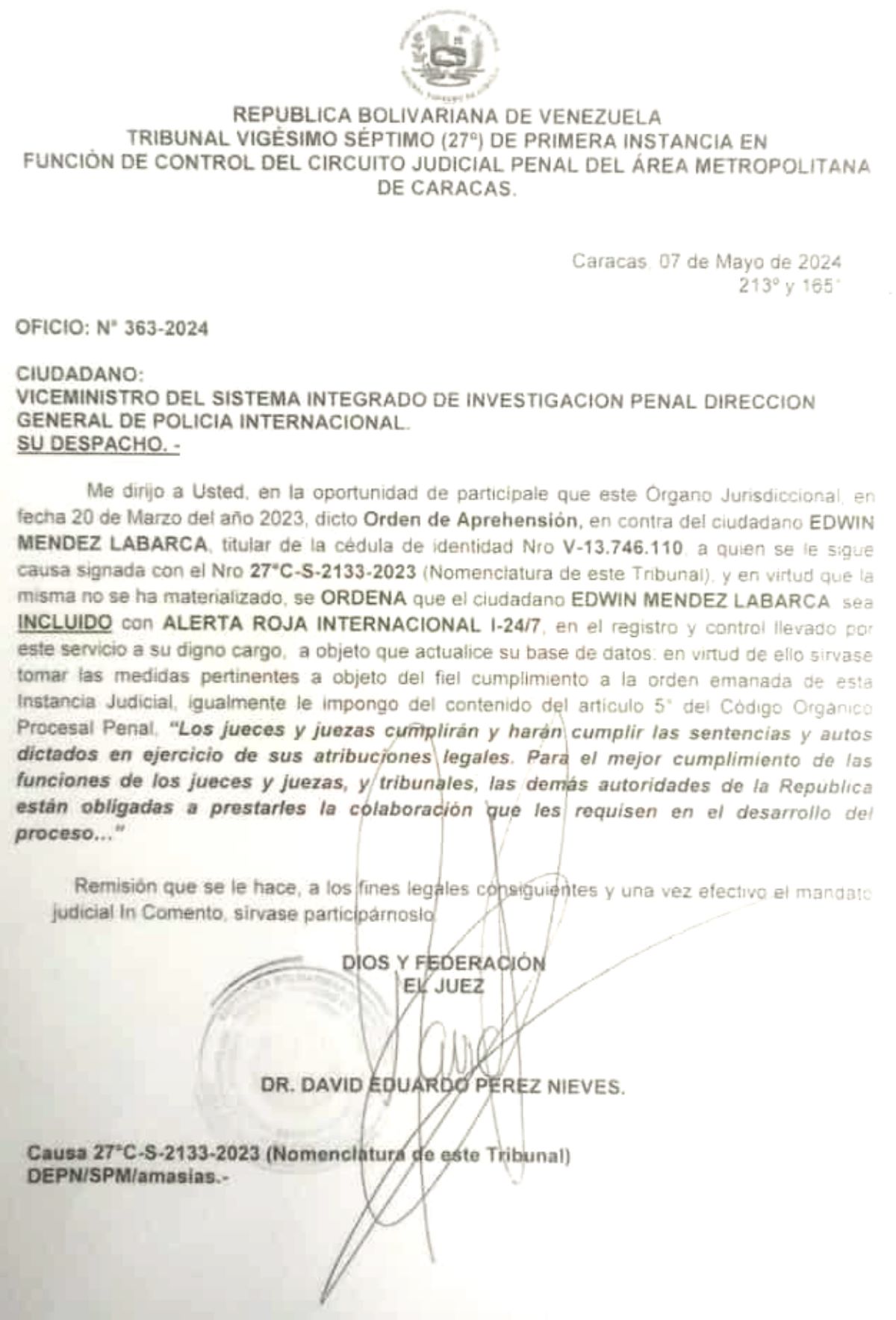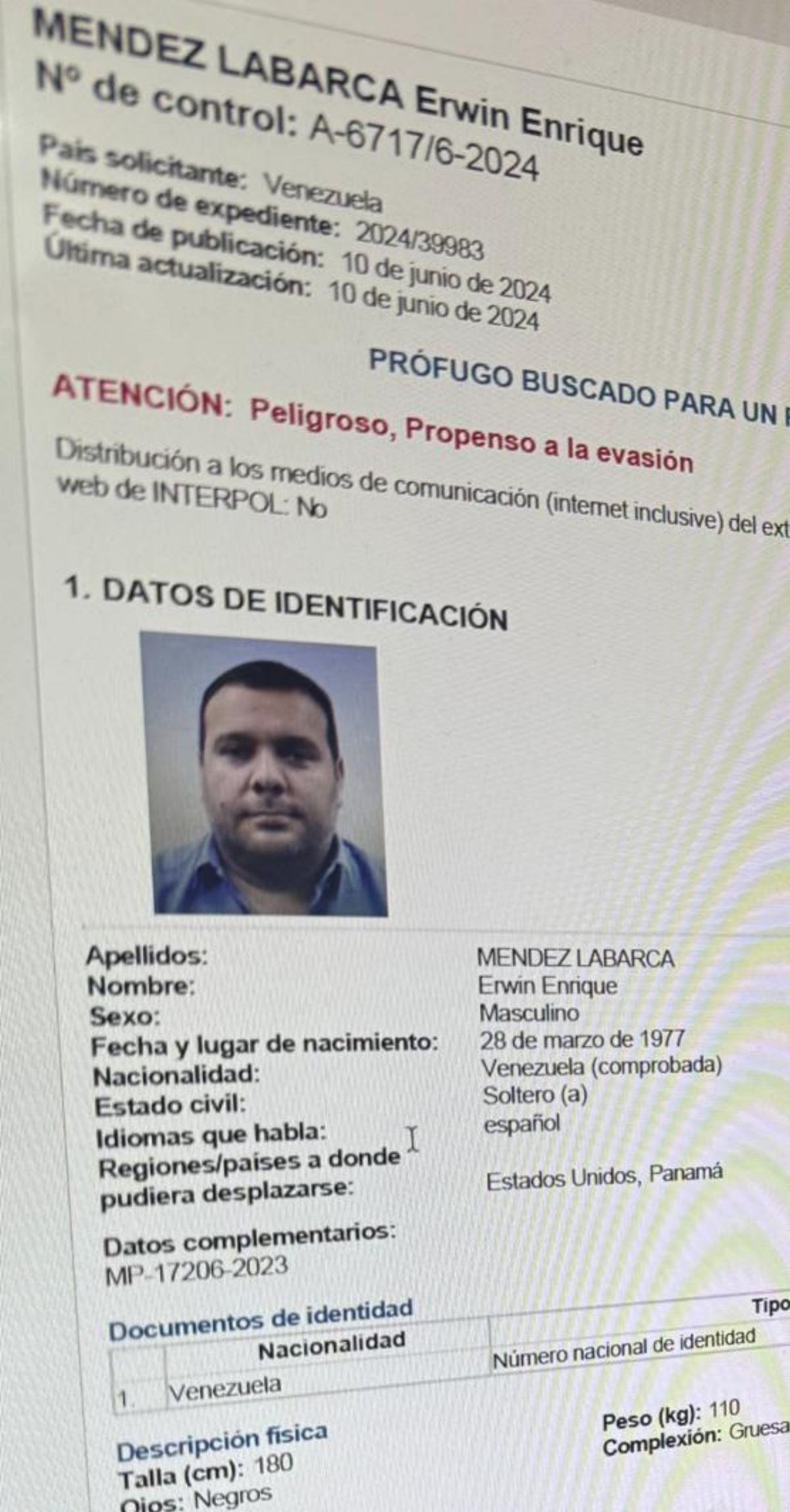 Por su parte, la Fiscalía 99° Nacional Especializada Contra Terrorismo y Secuestro, en un oficio fechado el 22 de mayo de 2024, solicitó también a la Dirección General de Policía Internacional (Interpol) activar los protocolos necesarios para la captura de Méndez Labarca, quien figura como acusado, según el caso seguido por el Ministerio Público de Venezuela, identificado como MP-17206-2023.