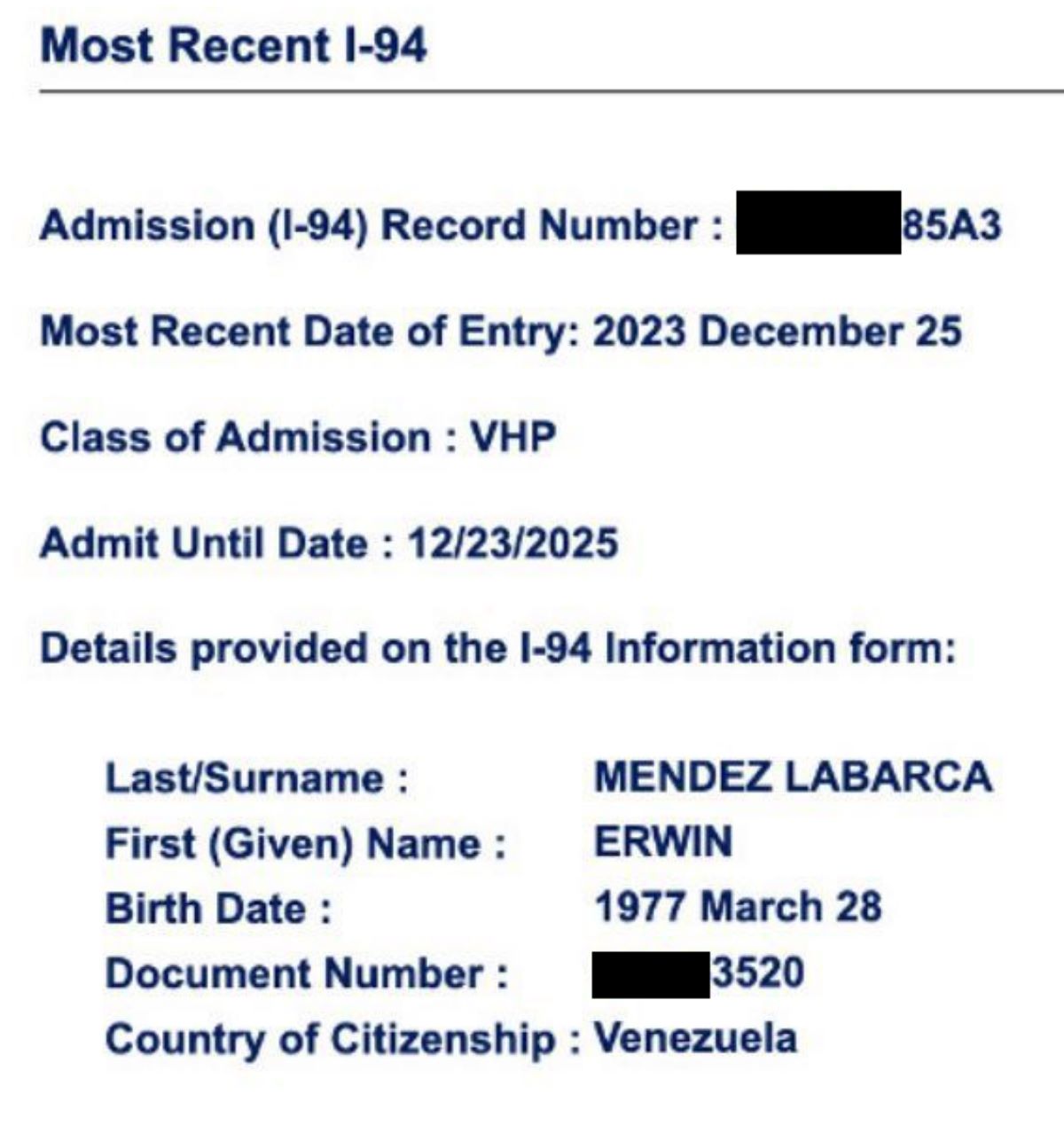 De acuerdo con el formulario de Entrada/Salida I-94, emitido a los extranjeros que ingresan a los Estados Unidos, por el Servicio de Aduanas y Protección Fronteriza (CBP) del Departamento de Seguridad Nacional (DHS), el ingreso de Méndez Labarca a territorio estadounidense, a través del Aeropuerto de Miami, quedó registrado el 25 de diciembre de 2023. El registro indica que se le otorgó un permiso de estancia hasta el 23 de diciembre de 2025, bajo la clasificación «VHP» (Venezuelan Humanitarian Parole), referido al programa de permiso humanitario para venezolanos.