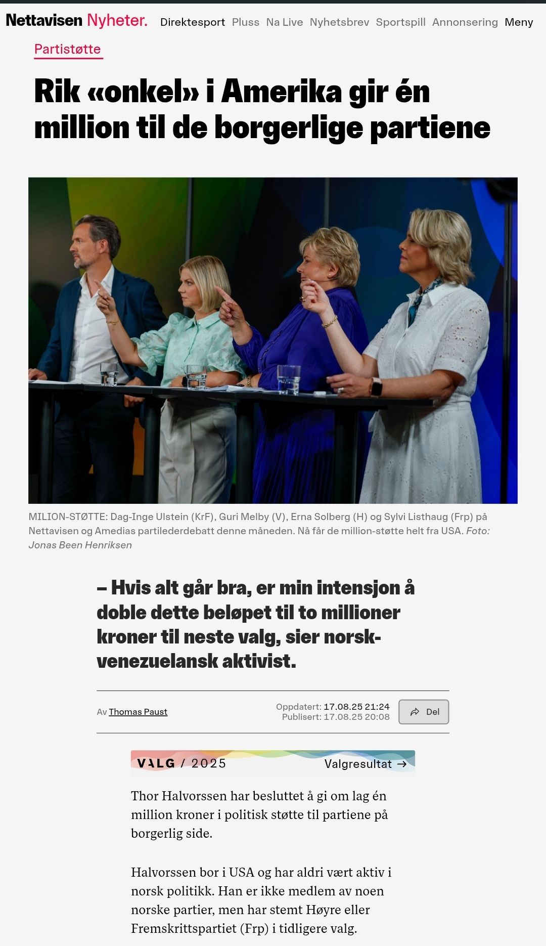Un episodio inusual en la política noruega ha generado debate dentro y fuera del país. El activista noruego-venezolano que en los últimos años se ha convertido en un influyente donante confirmó haber entregado un millón de coronas a tres partidos conservadores: Høyre (Partido Conservador), Fremskrittspartiet (Frp, Partido del Progreso) y Kristelig Folkeparti (KrF, Partido Demócrata Cristiano).