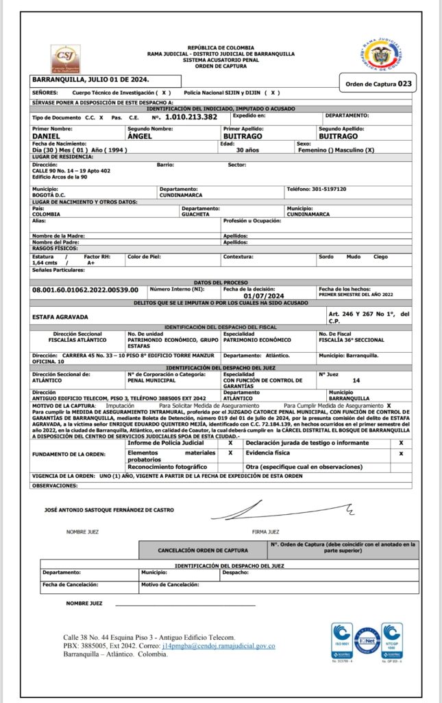 En mayo de 2024 obtuvo orden de captura contra Uribe Guerra por cuatro procesos distintos. La mujer se mantuvo prófuga hasta el 1 de octubre, cuando fue ubicada en un hotel del barrio Galerías, en Bogotá, registrada bajo la identidad falsa de María del Rosario Beltrán Guerra.